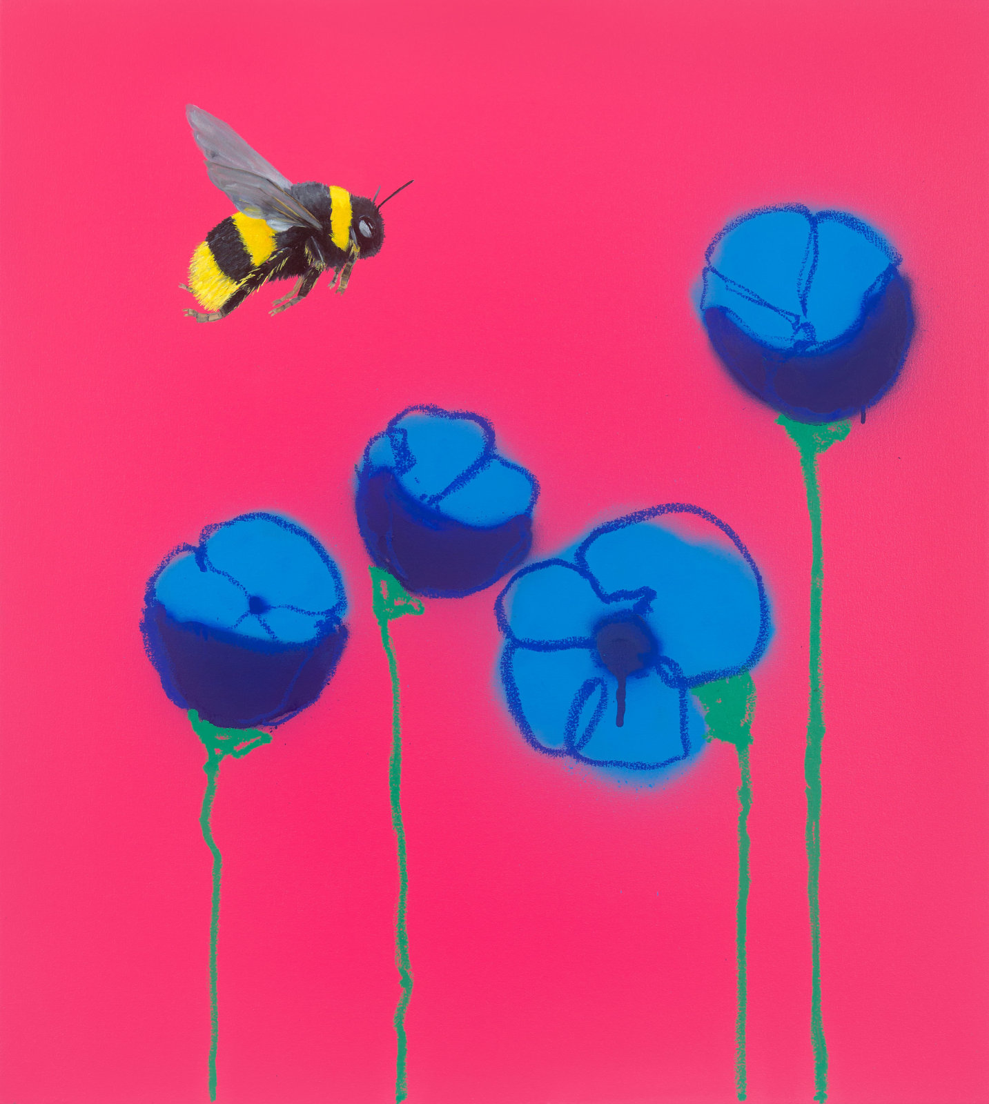 "Bee Scene with Poppies (Red with Blue)" painting by Adam Umbach American artist based in Brooklyn. Available at Carousel Fine Art in Atlanta.