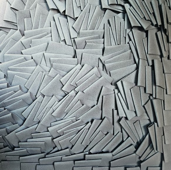 "Green Silence of the Soul" fusion of textile art and mixed media artwork by Rodrigo Franzao, a Brazilian artist currently based in the United States. Available at Carousel Fine Art.
