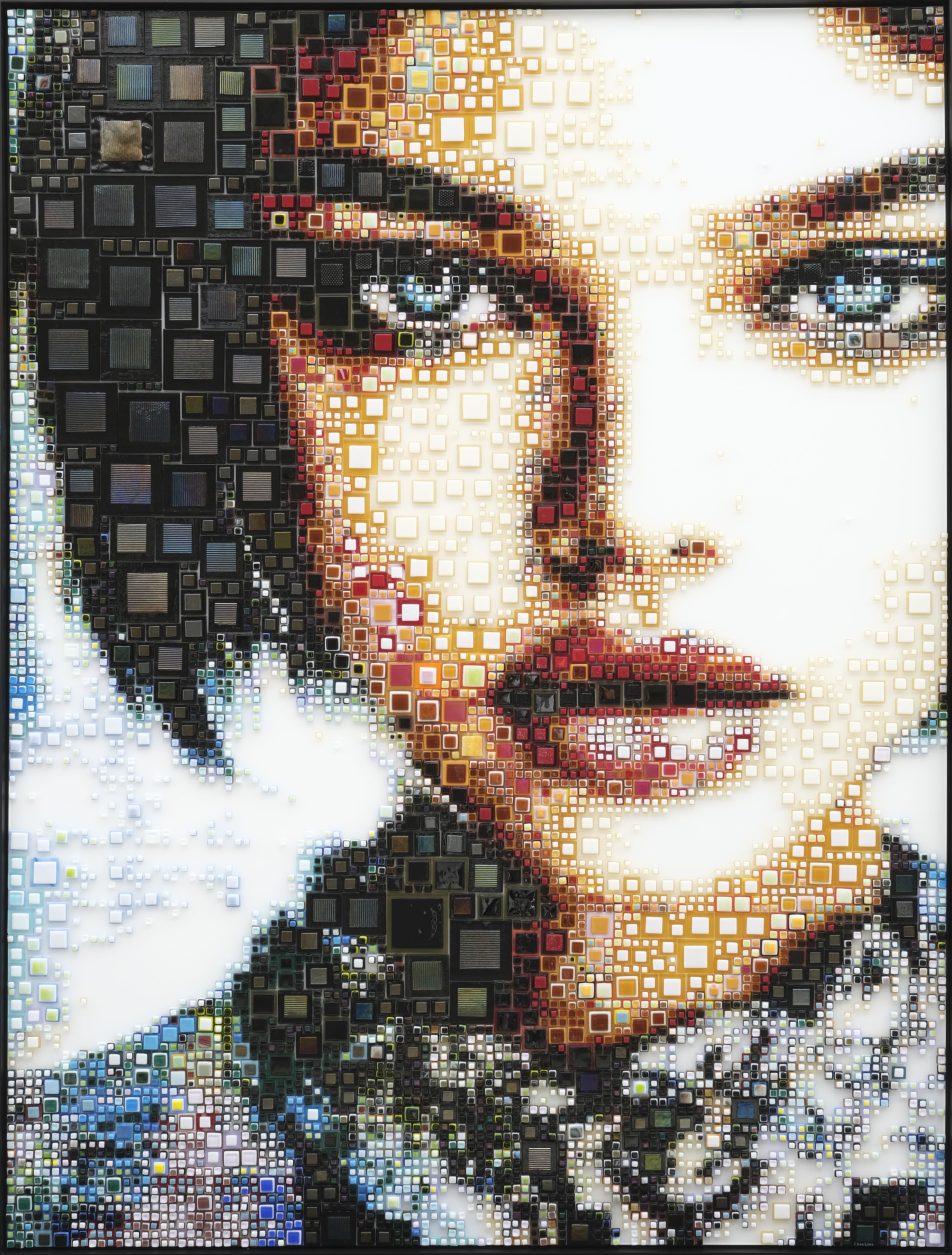 Nowhere is this dialogue between material and meaning more evident than in her glass mosaic portraits. Scheltjens creates mosaic portraits from thousands of hand-cut glass shards. Each shard is individually selected, cut, and arranged by hand before being fused together at around 800°C.