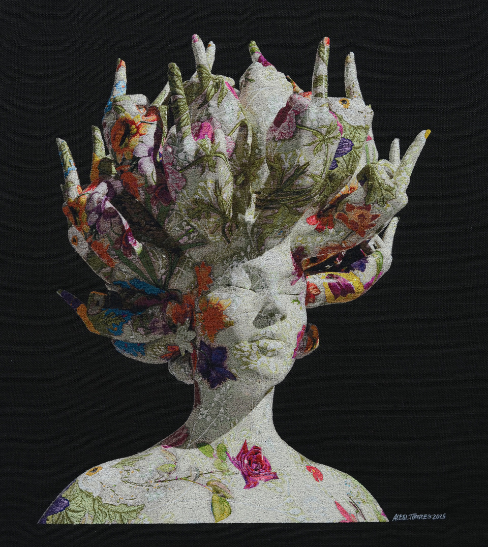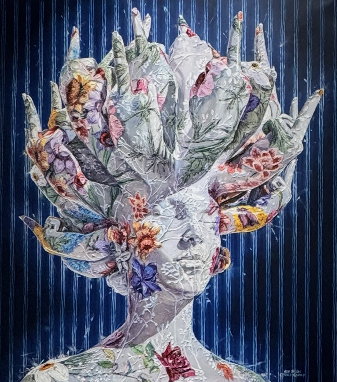 At first glance, the images appear meticulously woven — threads, braids, lattices of color and form. This textile-like approach becomes a metaphor for the construction of belief itself: our assumptions, habits, values, and inherited narratives layered one strand at a time. The result is a surface that feels both decorative and disquieting, a reminder that beauty can carry sharp edges when paired with intent.