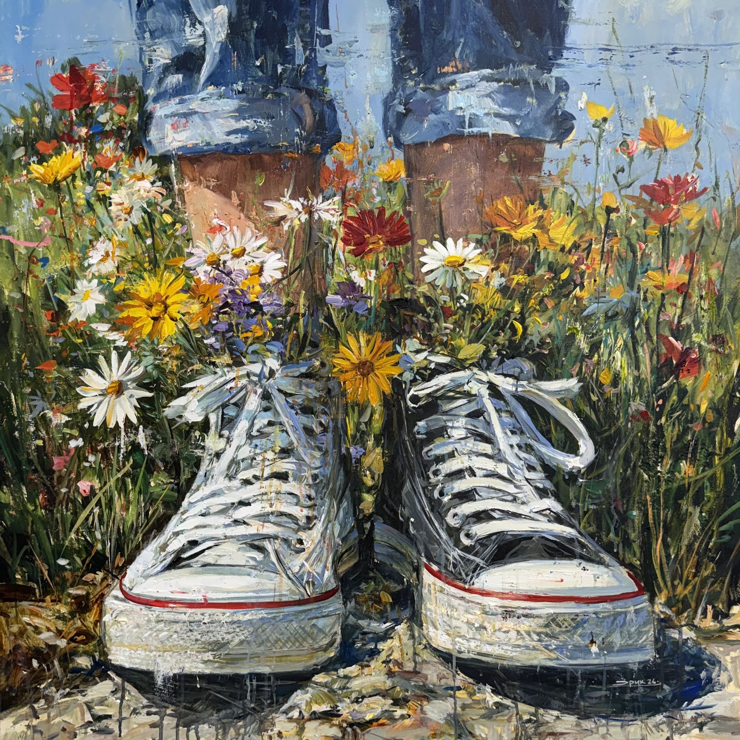 At the center of the series, shoes become vessels. From within them, wildflowers emerge-unruly, vibrant, and alive-pushing upward as if memory itself were taking root. They do not grow delicately, but insistently. There is something quietly radical in this gesture: the idea that even the most worn, familiar parts of ourselves carry the potential for transformation.