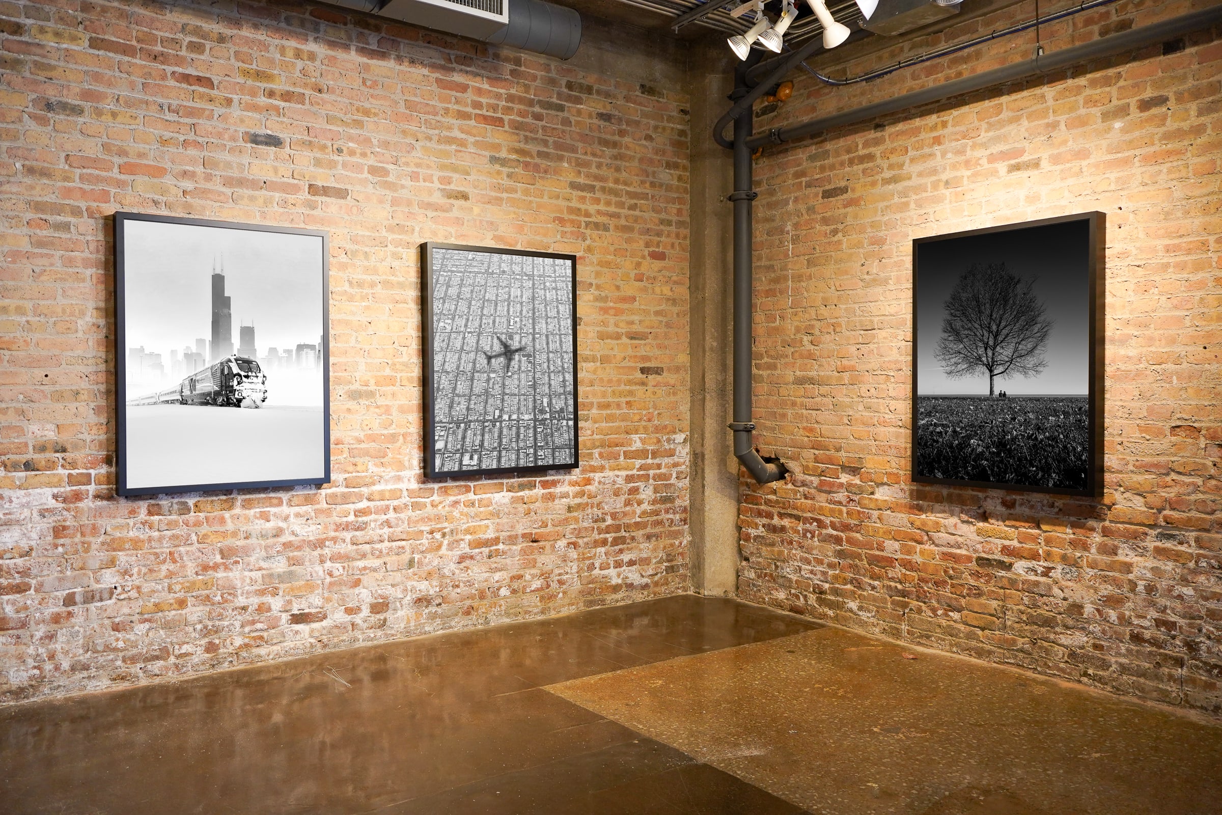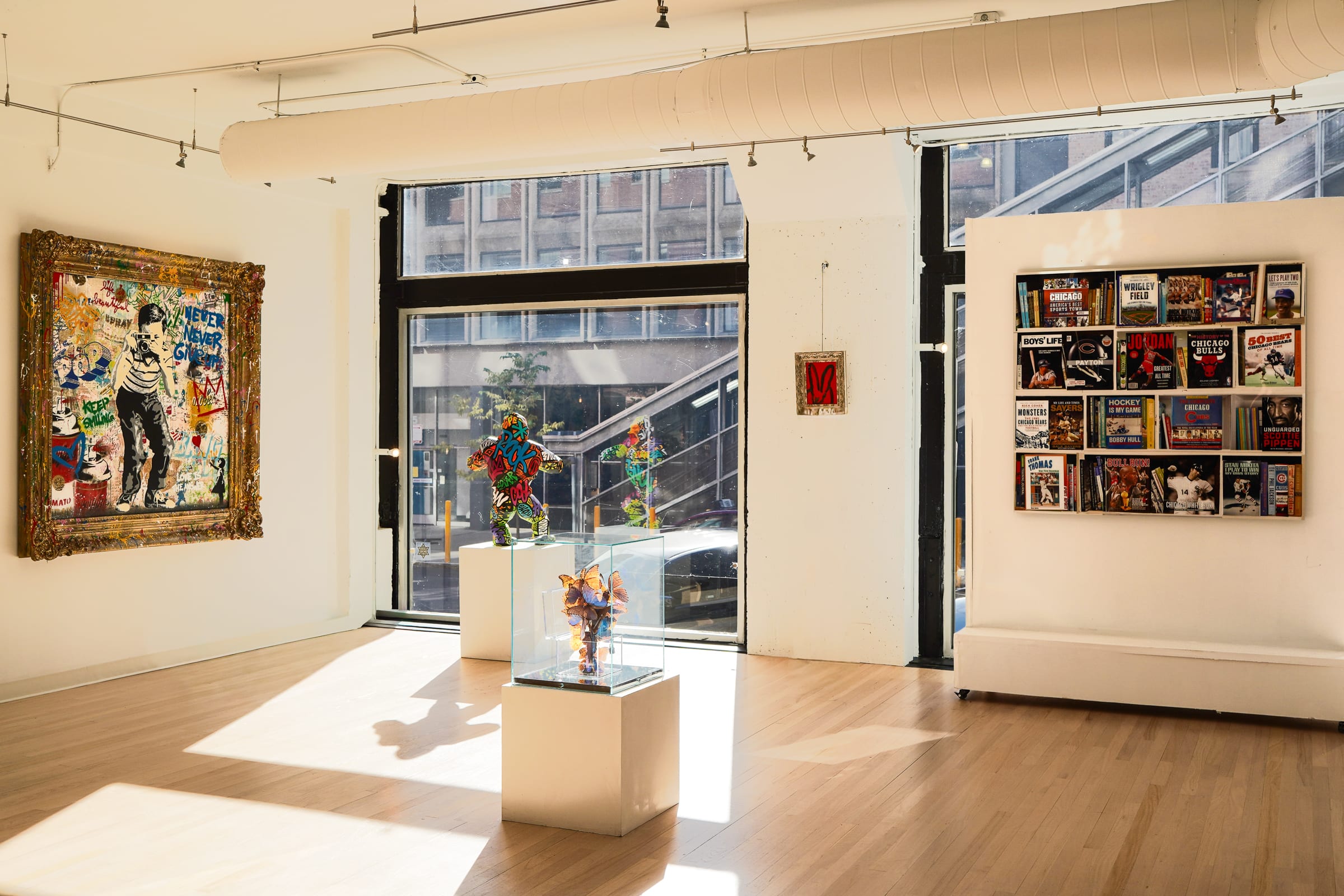 Head upstairs to explore a curated mix of global contemporary artists. With works by Santos, Mr. Brainwash, Caroline Dechamby, and Patrick Hughes, the space shifts into a spectrum of color, texture, and imagination. Each wall offers its own energy, from expressive abstraction to pop-influenced visuals—creating a contrast to Peterson’s monochrome world below. Together, the two levels invite collectors to experience the full range of contemporary art currently shaping Chicago’s scene.